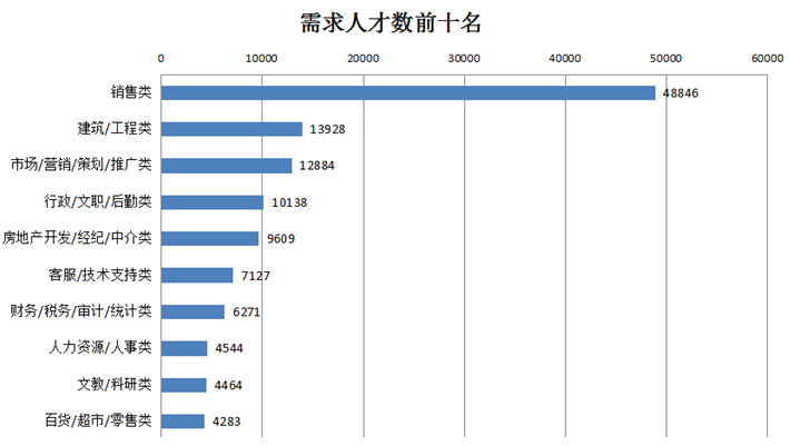 1. 位居需求榜前十名的职位:销售类、建筑/工程类、市场/营销/策划/推广类、行政/文职/后勤类、房地产开发/经纪/中介类、客服/技术支持类、财务/税务/审计/统计类、人力资源/人事类、文教/科研类、百货/超市/零售类等职位类型。这十个职位类型的需求人才数总计122094人,占人才总需求量的37.54%,其中销售类职位需求长期以绝对优势位居首位,其需求人才数达到48846人,占比达到15.02%,比上年同期的40509人增加8337人,增幅为20.58%,本季度需求增长量位居第一位。