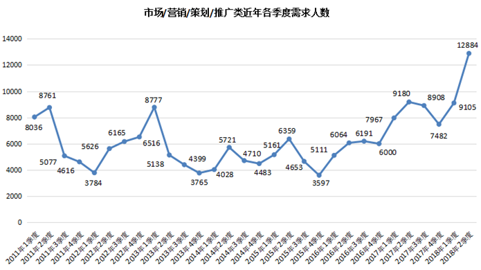 3. 市场/营销/策划/推广类职位人才需求量达到12884人,与上年同期的9180人相比增加3704人,增幅高达40.35%。