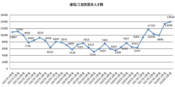 2. 建筑/工程类职位的求职人才数为25436人,创历史新高,与去年同期相比增长2529人,同比涨幅为11.04%。