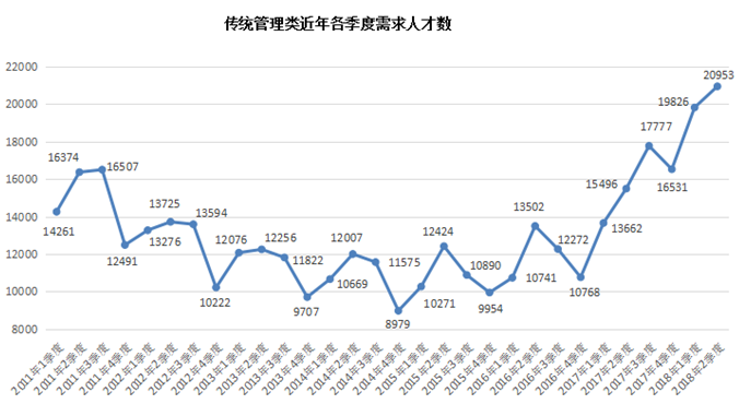 5. 三大传统管理类职位(包含行政/文职/后勤类、人力资源/人事类及财务/税务/审计/统计类等职位类别,下同)的人才需求同比大幅增长,创历史新高,其人才需求总量为20953人,与上年同期相比增加5457人,同比涨幅达到35.22%。