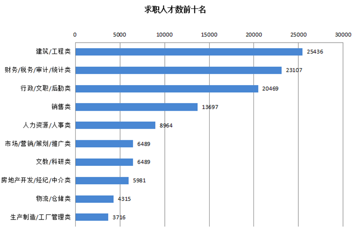 1. 位居求职榜前十名的职位:建筑/工程类、财务/税务/审计/统计类、行政/文职/后勤类、销售类、人力资源/人事类、市场/营销/策划/推广类、文教/科研类、房地产开发/经纪/中介类、物流/仓储类及生产制造/工厂管理类等职位类型。这十个职位类型的求职人才数量总计118663人,合计占比达到56.65%。其中,建筑/工程类、财务/税务/审计/统计类及行政/文职/后勤类这三类职位类型的求职人才数稳居前三位,均超过20000人。