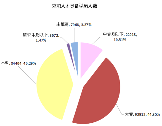 6. 广西人才网联系统求职人才学历长期集中在大专和本科学历,其求职人才数占比分别为44.35%和40.29%,大专和本科学历的求职人才共计177316人,与上年同期的163848人相比增加13468人,小幅增长8.22%。