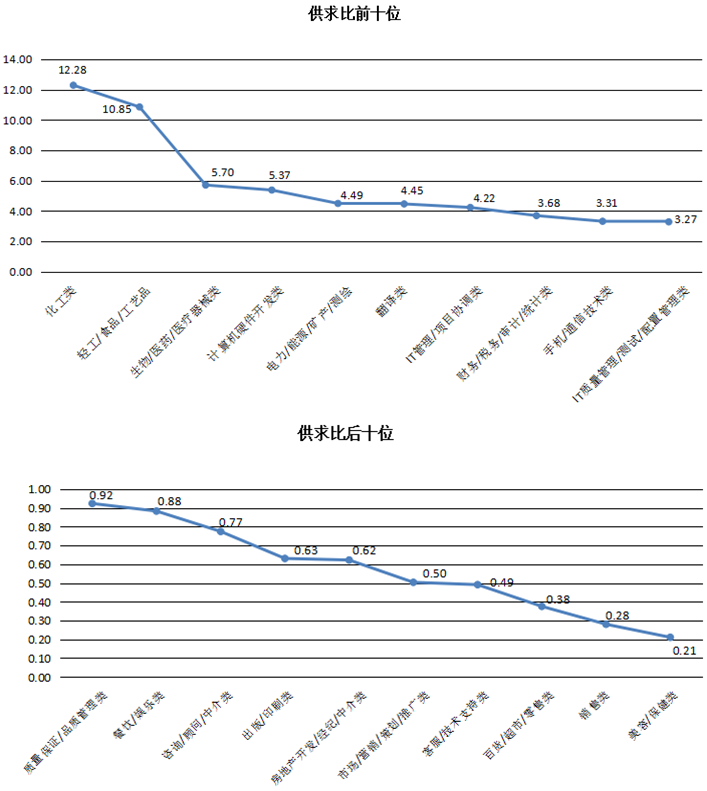 其中,由于需求极少,化工类、轻工/食品/工艺品类职位就业竞争压力较大,其供求比分别高达12.28和10.85,位居供求比前两位;而服务业三类职位和销售类等职位由于人员流动性大等特征,需求长期旺盛,供求比长期位居供求比后十位,其合计供求比分别仅为0.46和0.28。