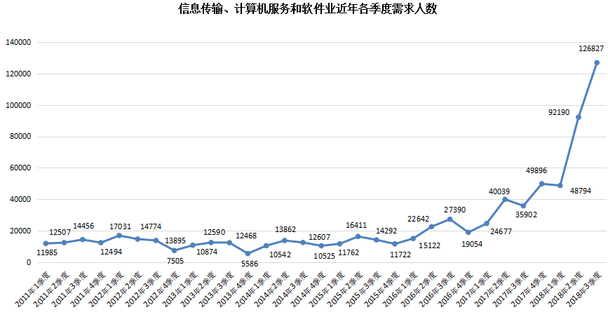 2. 信息传输、计算机服务和软件业人才需求突破十万大关,其人才需求量达到126827人,需求占比达到32.95%,比上年同期的35902人增加90925人,涨幅高达253.26%,成为本季度人才需求增长量最大的行业类型。