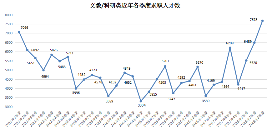 2018年第三季度,广西人才网联系统中文教/科研类职位的人才供应量同比大幅增长,其求职人才数为7678人,与上年同期相比增加1469人,同比涨幅达到23.66%。