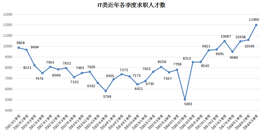 6. IT类职位(包含计算机硬件开发类、计算机软件开发类、IT管理/项目协调类、IT质量管理/测试/配置管理类、IT运维/技术支持/系统集成类、互联网/移动互联网开发/设计类、互联网产品/运营管理/电子商务类,下同)的人才供应量创历史新高,其求职人才数为11990人,与上年同期相比增加1503人,同比涨幅为14.33%。