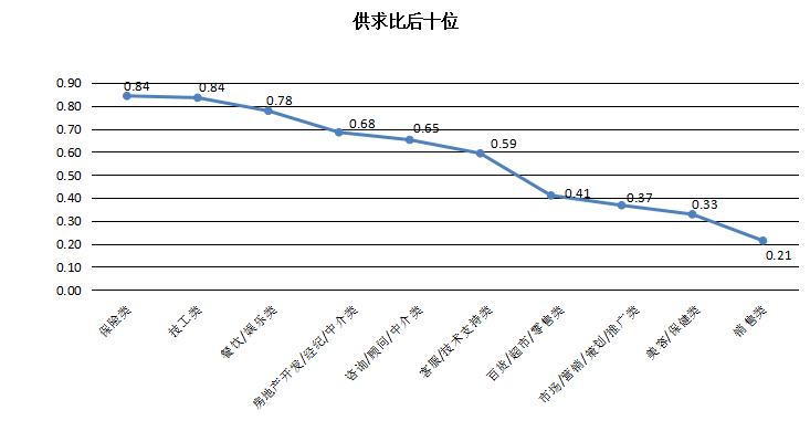 其中,由于需求极少,计算机硬件开发类、轻工/食品/工艺品类及化工类职位就业竞争压力较大,其供求比分别高达19.56、13.91及12.18,位居供求比前三位;而服务业三类职位和销售类等职位由于人员流动性大等特征,需求长期旺盛,供求比长期位居供求比后十位,其合计供求比分别仅为0.51和0.21。