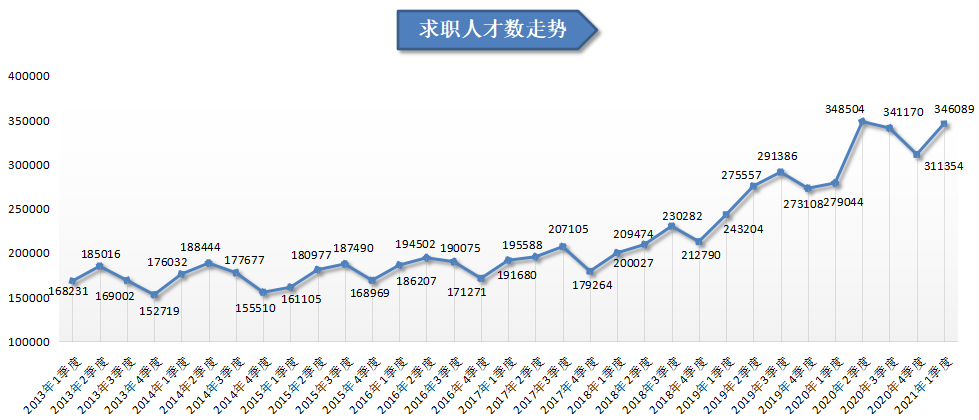 2021年第一季度,通过广西人才网招聘人才的用人单位(简称用人单位,下同)数量为12691家,比上年同期微增0.66%;需求人才数为168895人,比上年同期下滑3.74%;求职人才数为346089人,与上年同期相比增长24.03%;总人才供求比为2.05(即人才需求人数或职位数为1时,人才供给或求职人才数为2.05,下同),比上年同期的1.59增加0.46,比上季度的2.23减少0.18,就业压力仍较大。