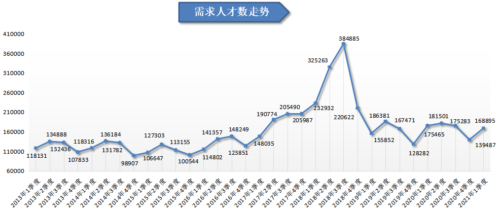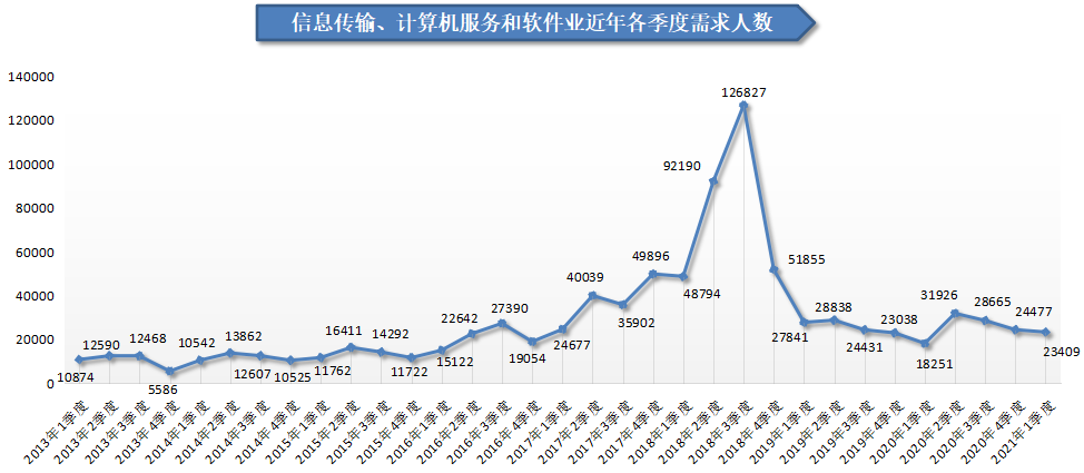 2021年第一季度,广西人才网中信息传输/计算机服务和软件业需求人才数为23409人,比上年同期的18251人增加5158人,涨幅为28.26%。其中互联网行业人才需求增长较多,其需求人才数为7718人,比上年同期增加3282人,同比涨幅达73.99%。