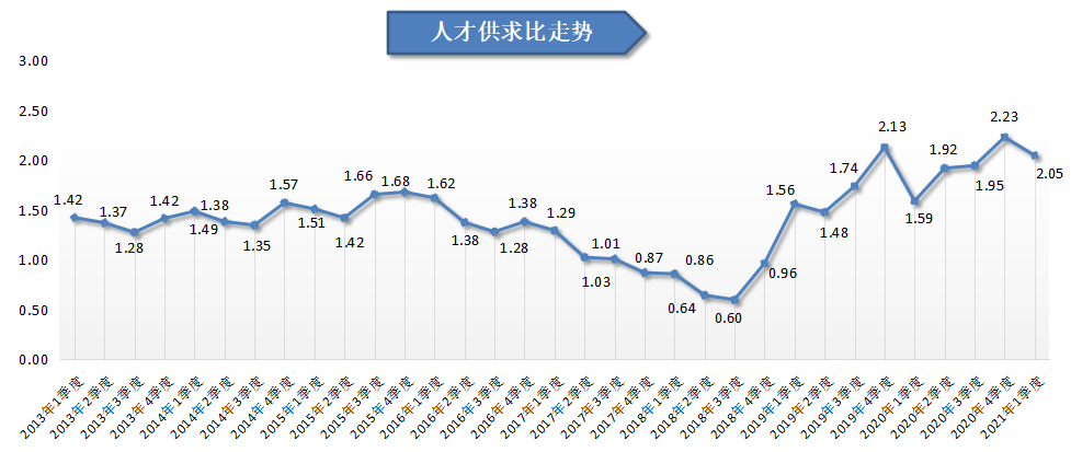 由于人才供应增长较快,而人才需求数量增长有限,使得广西人才网近几个季度的人才供求比一直处于较高水平,2021年第一季度广西人才网人才供求比达到2.05,就业压力仍较大。