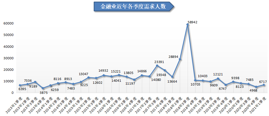 2021年第一季度,广西人才网中金融业的人才需求量持续低迷,其需求人才数为6717人,与上年同期的9398人相比减少2681人,同比下滑28.53%。其中,对其影响较大的行业分别有银行和保险行业,这两个行业的需求人才数分别为418人和2361人,与上年同期相比分别减少了1036人和778人,降幅分别为71.25%和24.78%。