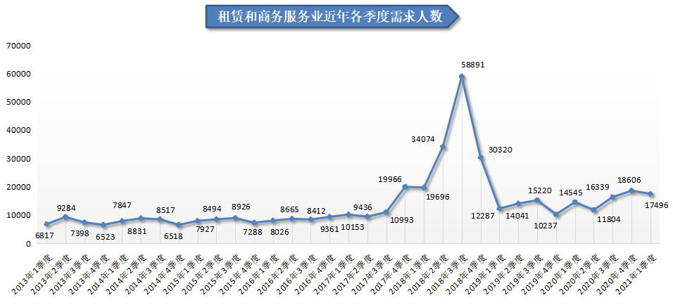 2021年第一季度,广西人才网中租赁和商务服务业需求人才数为17496人,与上年同期的14545人相比增加2951人,同比增长20.29%,其中,职业中介服务行业和企业管理服务行业是租赁和商务服务业人才需求的主要增长点,这两个行业的需求人才数分别为4604人和4283人,与上年同期分别增加2571人和1397人,涨幅分别为126.46%和48.41%。