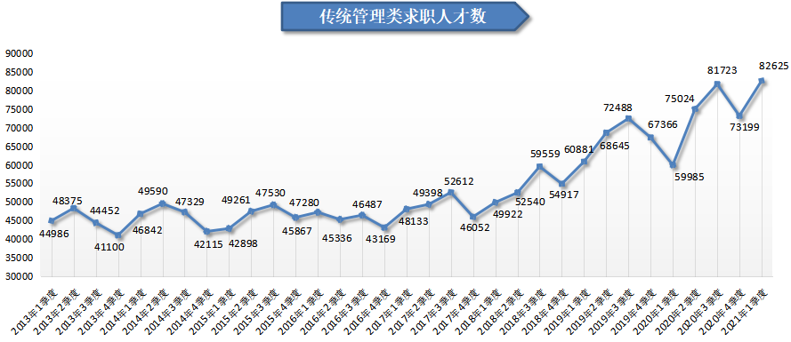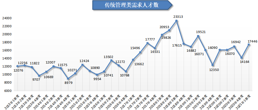 2021年第一季度,广西人才网中传统管理类职位(包含行政/文职/后勤类、人力资源/人事类、财务/税务/审计/统计类职位,下同)人才需求量为17446人,与上年同期的16090人相比增加1356人,同比增长8.43%。其中,行政/文职/后勤类、人力资源/人事类、财务/税务/审计/统计类职位需求人才数分别为8299人、3246人、5901人,与上年同期相比分别增加了662人、490人和204人,涨幅分别为8.67%、17.78%、3.58%。
