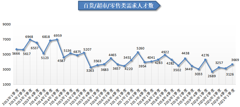2021年第一季度,广西人才网中百货/超市/零售类职位需求人才数为3669人,比上年同期的4276人减少607人,同比下滑14.20%。其中人才需求减少较明显的具体职位有店长/店面管理员、理货员/陈列员/防损员等职位,比上年同期分别减少384人和200人,降幅分别为39.18%和70.42%。