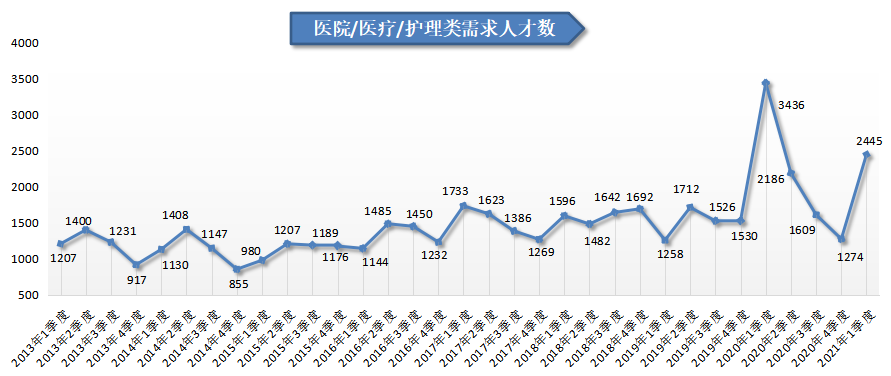 2021年第一季度,广西人才网中医院/医疗/护理类职位的求职人才数为7312人,与上年同期的6112人相比增加1200人,同比增长19.63%,但低于前三季度的求职人数,稍显回落态势。
