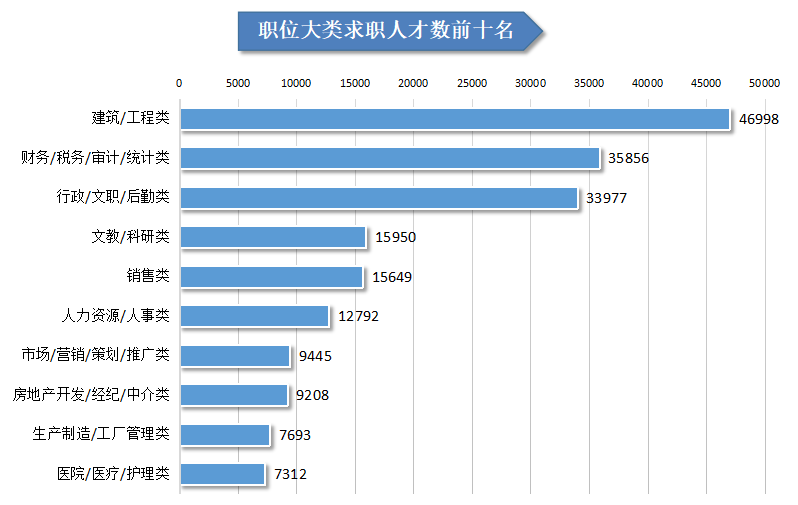 在具体职位中,会计师/会计、行政专员/助理、工程造价师/预结算/审计等职位较受求职者青睐,求职人才数均超过6000人,求职人才数分别为9353人、6915人和6659人。