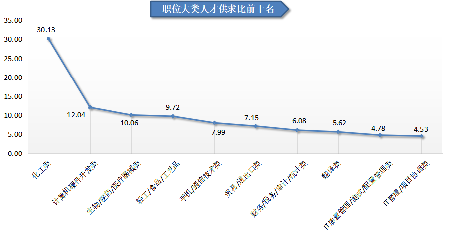 从具体职位看,在人才竞争激烈程度的前二十名具体职位中,由于需求极少,最高供求比高达214.00,达到214人竞争1个岗位;第二十名的职位供求比也达到26.00。