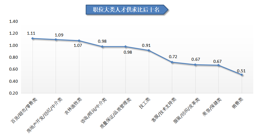 2021年第一季度,虽然总体供求比继续维持在较高水平,但不少职位仍出现明显的人才紧缺情况,人才供求比后十位职位类别的需求人才数为62515人,占比37.01%,而其对应的求职人才数为45401人,占比为13.12%,合计人才供求比为0.73。其中,销售类以及美容/保健类等职位由于流动性强,需求长期旺盛,但由于其稳定性差等原因,一直遭到求职人才冷遇,供求比长期位于供求比排行榜后十位,供求比分别仅为0.51及0.67。