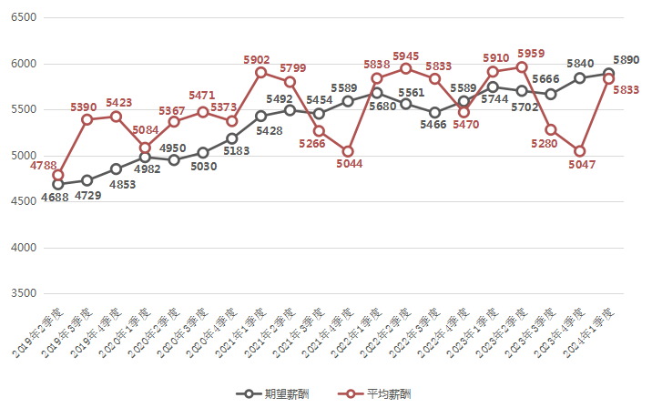 近五年求职者期望薪酬和用人单位发布职位平均薪酬对比走势图如下: