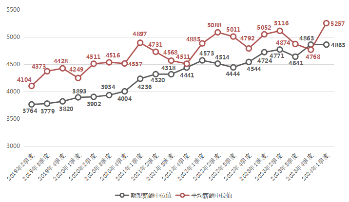 近五年求职者期望薪酬和用人单位发布职位薪酬中位值对比走势图如下: