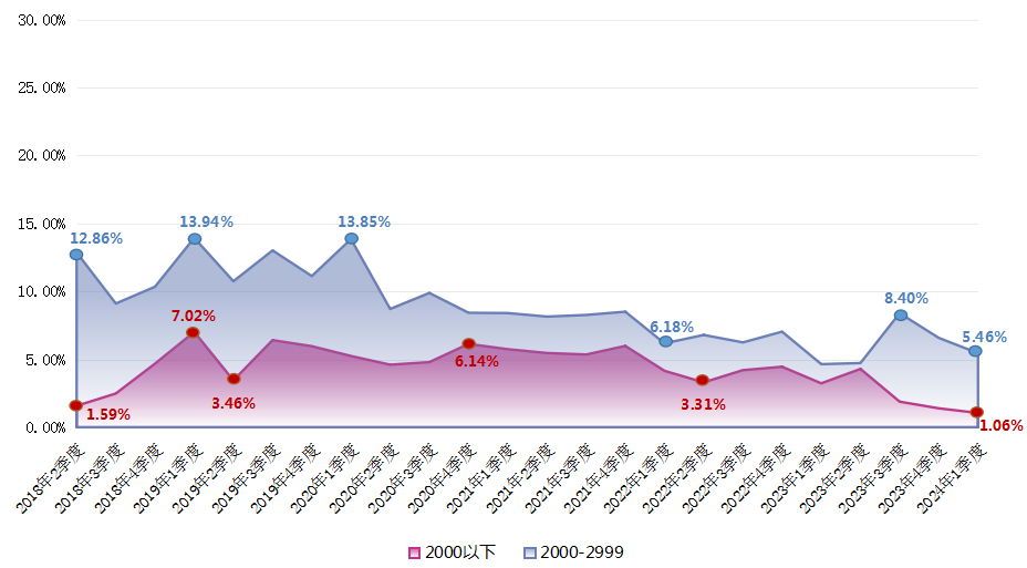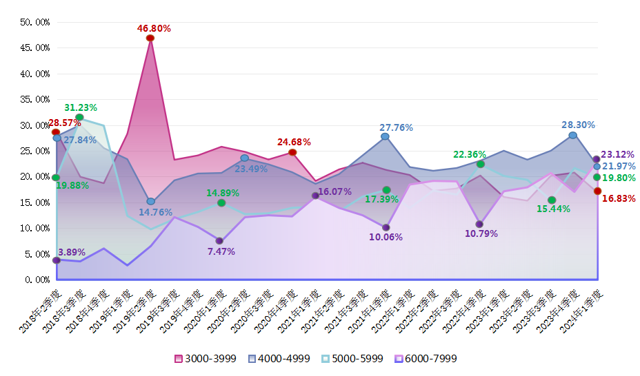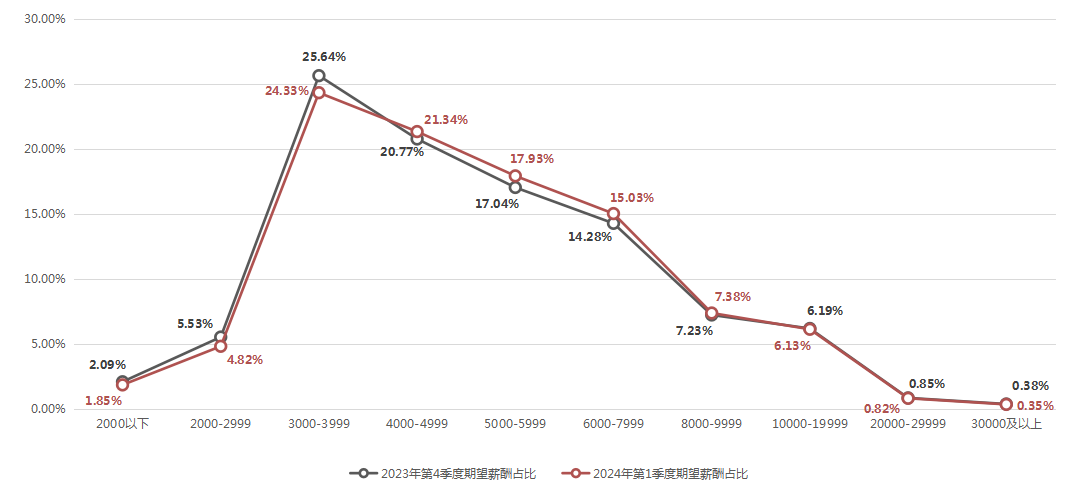 2024年第一季度,求职者期望的薪酬区间占比保持平稳,整体呈现出正偏态分布的特征,主要集中在3000-3999元/月区间,该区间的求职者期望薪酬占比达到24.33%。