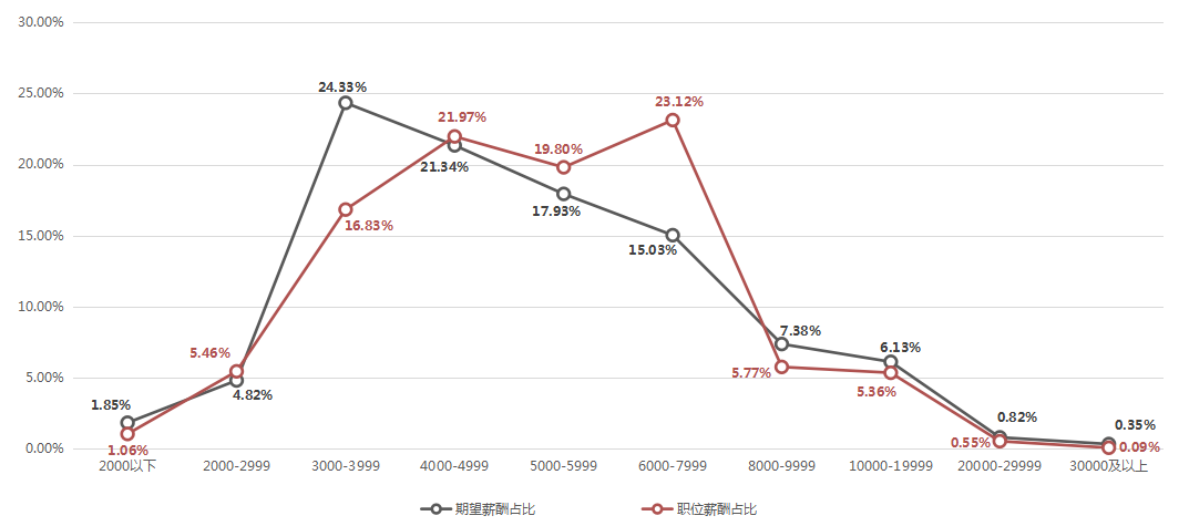 注4:职位平均薪酬指的是所属职位类别中用人单位发布职位的薪酬样本加权平均值,不代表单个职位的实际薪酬,例如高级管理类职位平均薪酬为10798元/月,但其有很多副总以上级别的高薪职位薪酬更高。期望薪酬指的是求职者期望从事职位类别的薪酬样本加权平均值。