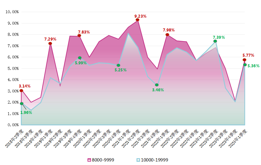 本季度职位薪酬区间占比主要集中4000-4999元/月区间、5000-5999元/月区间以及6000-7999元/月区间,占比分别为21.97%、19.80%和23.12%。整体来看,6000元/月是平均薪酬的分水岭,低于此水平的薪酬区间与上季度相比均呈现不同程度的下滑,而高于此水平的薪酬区间与上季度相比均呈现不同程度的增长。本季度降幅最大的薪酬区间是4000-4999元/月区间,环比下降了6.33个百分点;涨幅最大的薪酬区间是6000-7999元/月区间,环比增长了6.08个百分点。另外,8000以上元/月的各高薪区间占比均呈现不同程度的增长,其中8000-9999元/月区间占比增长至5.77%,环比增长3.63个百分点;10000-19999元/月区间占比为5.36%,环比增长3.32个百分点;20000以上元/月区间合计占比为0.64%,环比增长0.56个百分点。