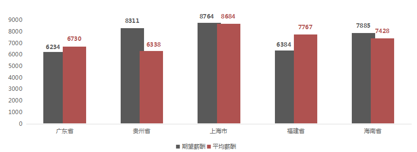 求职者期望最高的前五位职位类别分别为:高级管理类12344元/月、房地产开发/经纪/中介类9604元/月、互联网产品经理类9603元/月、人工智能/算法类8807元/月以及IT技术/项目管理类8785元/月;而期望从事以下五类职位的求职者对薪酬要求较低,包括:保安/家政服务类4529元/月、商场/超市/零售类4552元/月、行政/文职/后勤类4671元/月、客服/热线类4703元/月以及餐饮/娱乐类4705元/月。