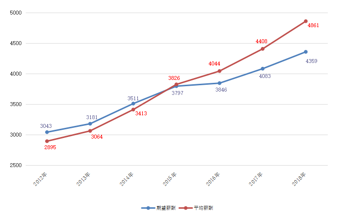近七年求职者期望平均薪酬和用人单位发布职位的平均薪酬对比走势图如下: