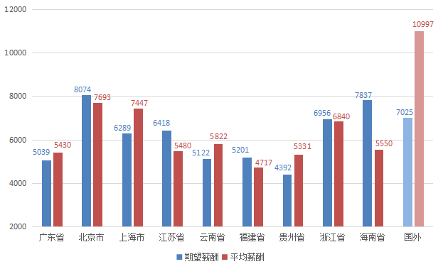 另外,用人单位发布驻区外的职位平均薪酬达到6835元/月,期望在区外工作的求职者对薪酬的要求达到5294元/月。区外职位样本虽然仅占总样本的3.06%,但呈现明显增长趋势,主要集中在广东省、北京市、上海市、江苏省以及云南省等地,且用人单位提供的薪资较高。