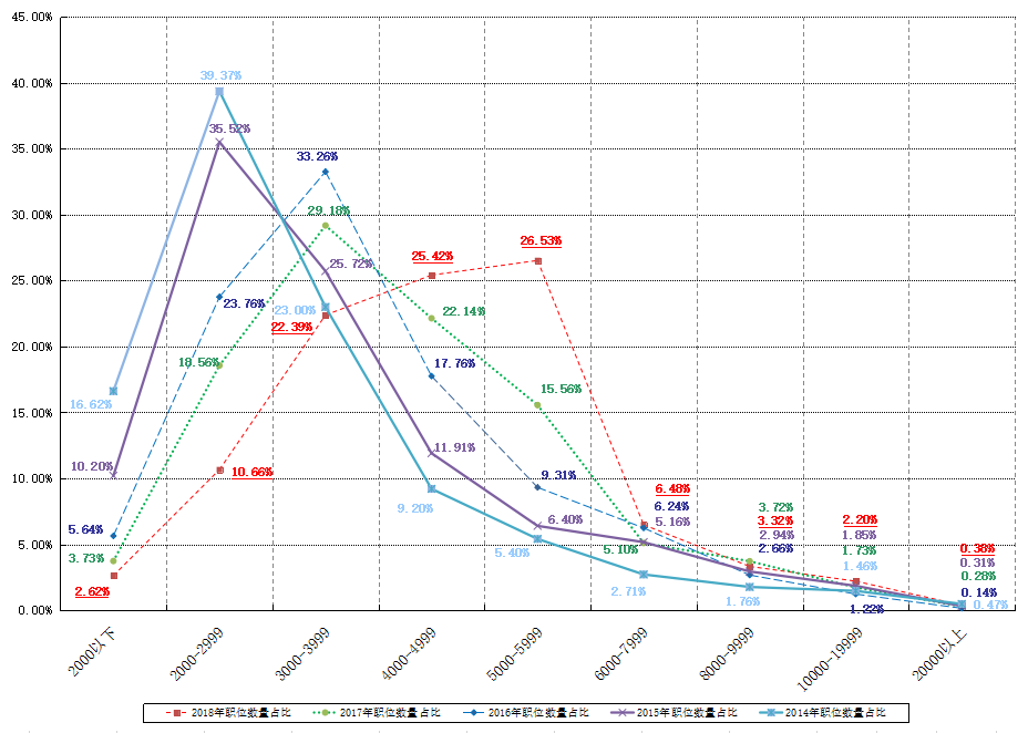 近四年各季度主要薪酬区间(单位:元/月)的职位数量占比曲线图如下:
