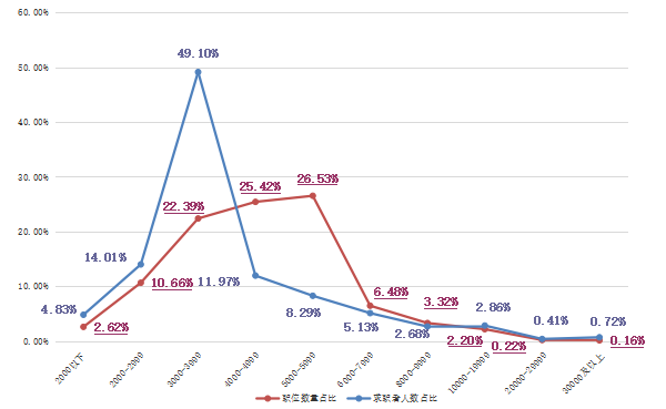 2018年求职者期望与职位薪酬(各薪酬区间分布)对比曲线图: