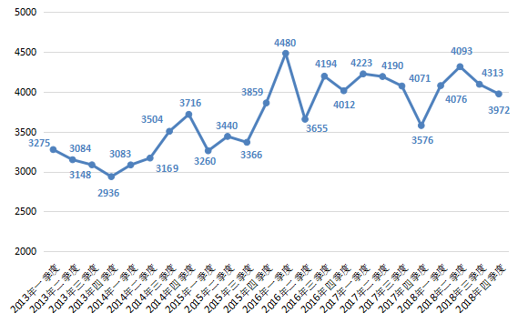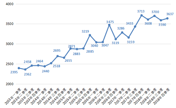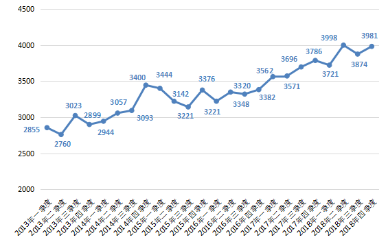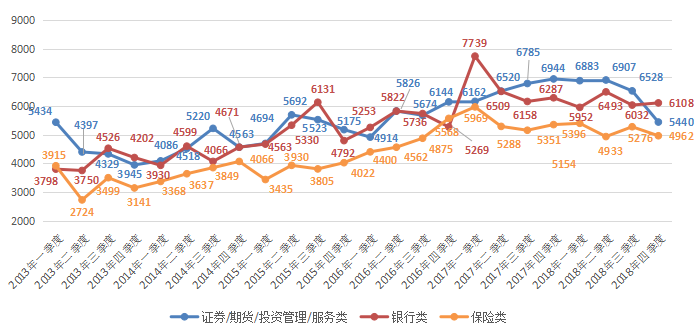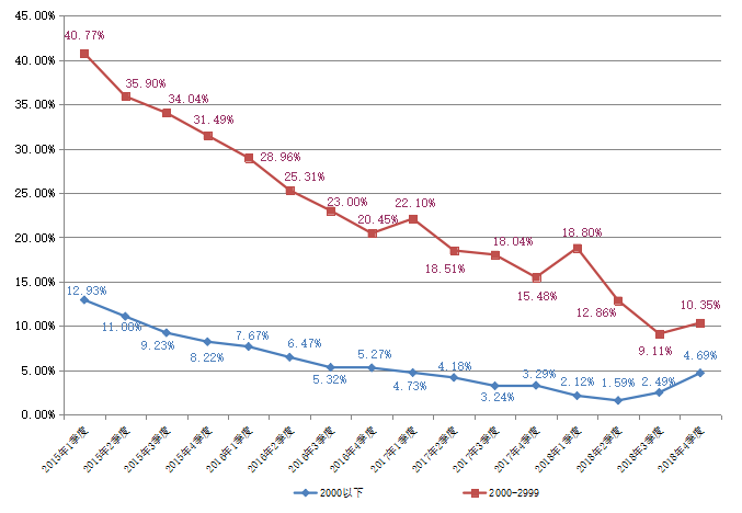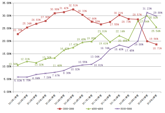 由上图可见,近四年2000元/月以下和2000-2999元/月较低薪酬区间呈现整体下滑趋势,已逐步退出历史舞台,虽然2018年第四季度职位数量占比均稍有回升,但占比仅为4.69%和10.35%。