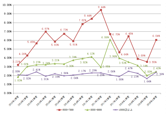 近四年各季度较高薪酬区间(单位:元/月)的职位数量占比曲线图如下: