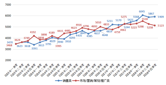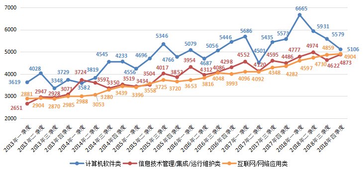 注:红色下划线数据为2018年职位数量占比,绿色数据为2017年职位数量占比,深蓝色虚线数据为2016年职位数量占比,紫色数据为2015年职位数量占比,浅蓝色数据为2014年职位数量占比。