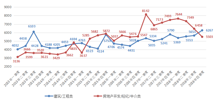 由上图可见,近四年6000-7999元/月、8000-9999元/月和10000及以上元/月较高薪酬区间曲线轨迹波动较大,但均有不同程度的增长。2018年第四季度广西人才网联系统中6000-7999元/月区间的职位数量占比增长至6.04%;8000-9999元/月区间的职位数量占比为2.43%,环比增长0.43个百分点;10000及以上元/月区间的职位占比为2.36%,环比增长0.72个百分点。