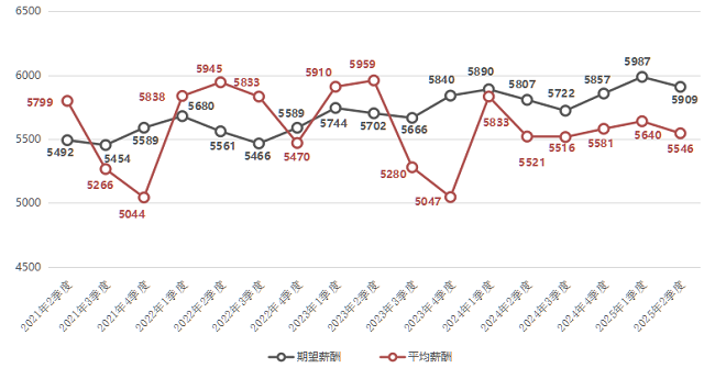 2025年第二季度,广西人才网中用人单位发布职位的平均薪酬水平连续2个季度增长后出现小幅回落,本季度平均薪酬为5546/月,与上一季度相比,降幅为1.67%。