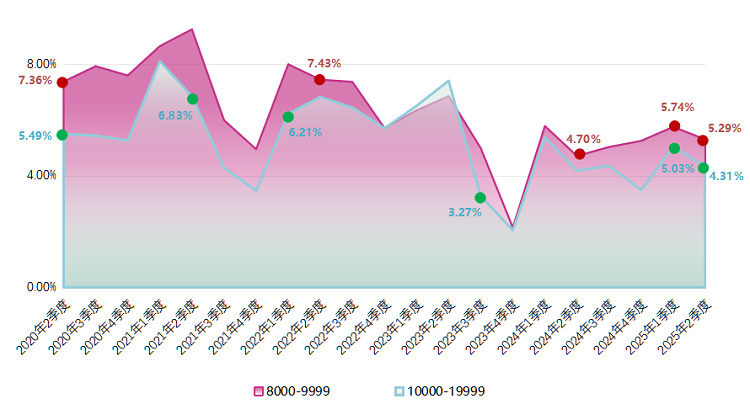 投融资类职位的平均薪酬在今年以来均保持在8000元/月的水平,且本季度与2025年第一季度相比有所增长,本季度平均薪酬为8625/月,环比增长7.01%。