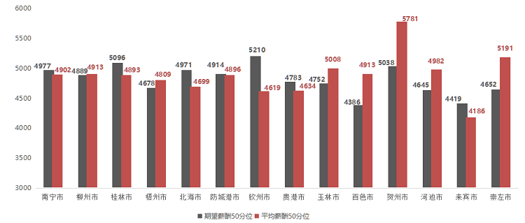 2:本报告所指薪酬是广西人才网中用人单位发布职位或求职者期望的税前总体收入水平,包含个人所缴纳的五险一金等内容(即应发工资),其展现的是招聘过程中职位对应的收入水平,主要折算为月薪进行计算,供用人单位和求职者参考使用。