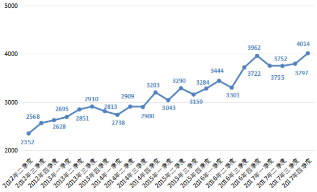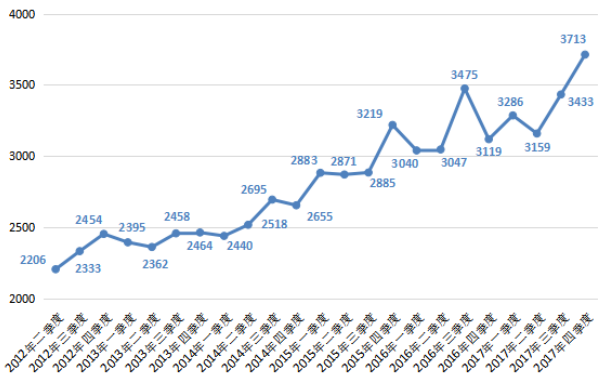 财务/税务/审计/统计类职位平均薪酬整体呈现平稳小幅增长的趋势,2017年第四季度达到历年最高值,平均薪酬为3786元/月,与三季度相比增长2.44%。