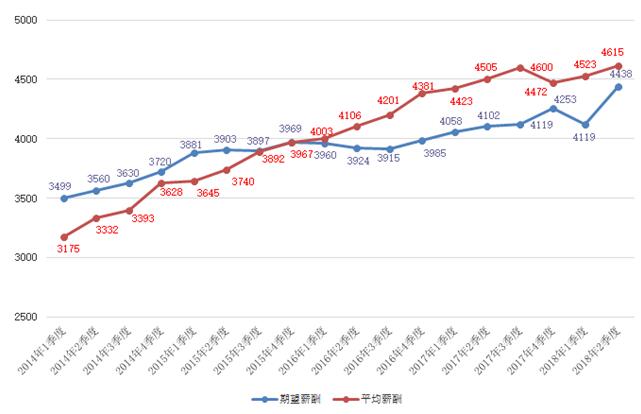 近五年各季度求职者期望平均薪酬和用人单位发布职位的平均薪酬对比走势图如下: