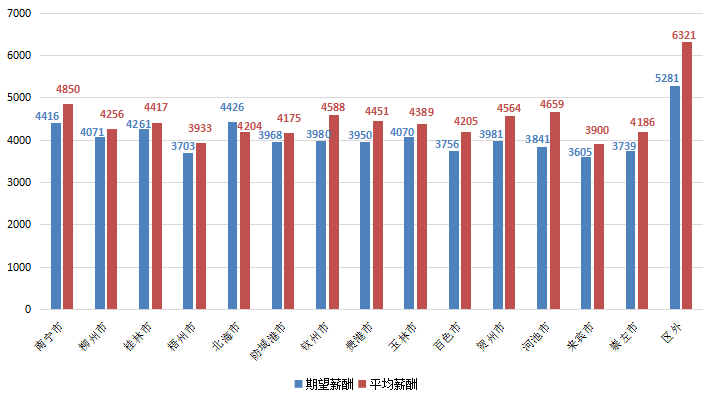 2:本报告所指薪酬是广西人才网联系统中用人单位发布职位或求职者期望的税前总体收入水平,包含个人所缴纳的五险一金等内容(即应发工资),其展现的是招聘过程中职位对应的收入水平,主要折算为月薪进行计算,供用人单位和求职者参考使用。