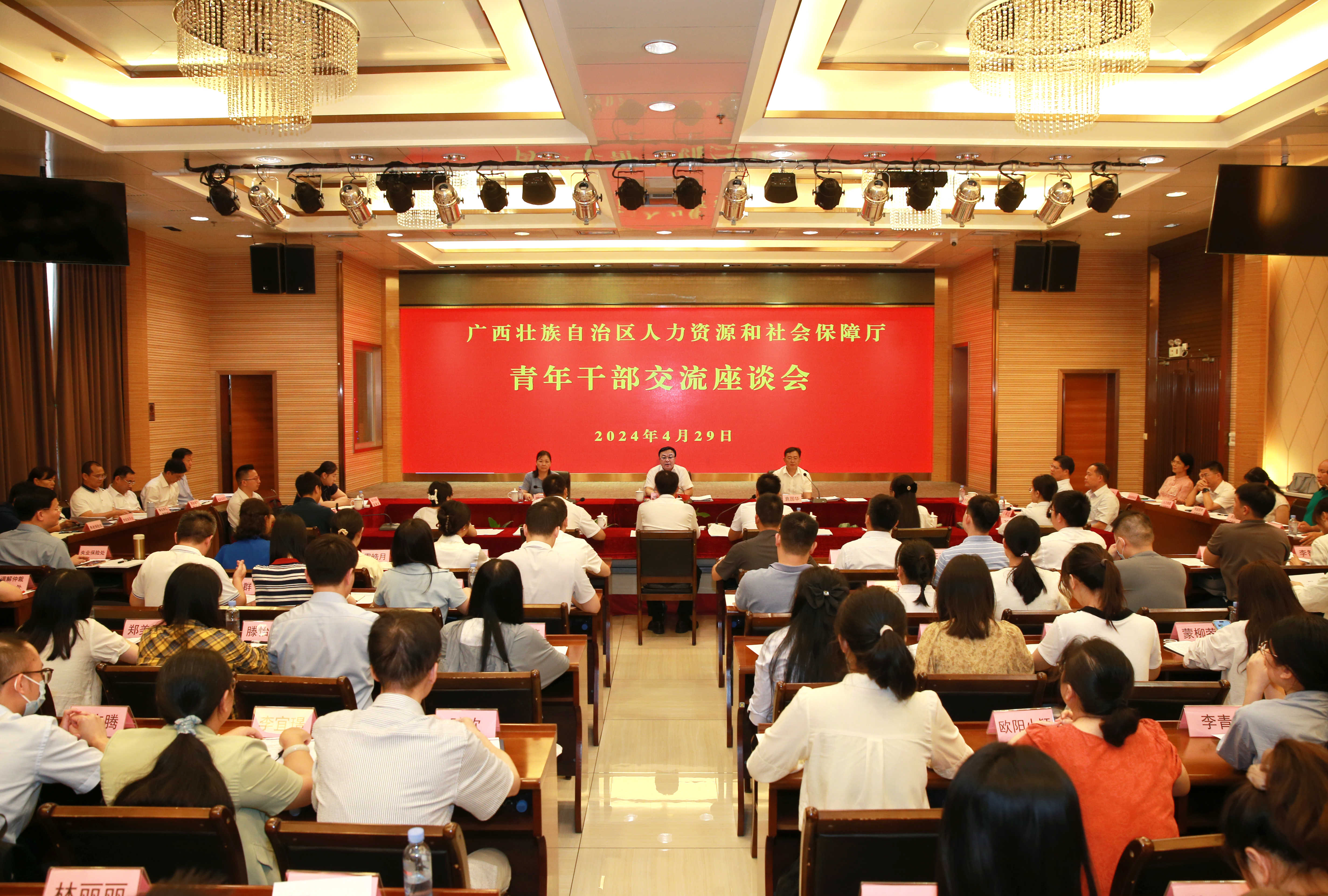 4月29日,在五四青年节即将到来之际,自治区人力资源社会保障厅召开青年干部交流座谈会。厅党组书记、厅长唐标文出席会议并讲话。厅党组副书记、副厅长袁国华主持会议。厅党组成员、驻厅纪检监察组组长蒙晓岚出席会议。