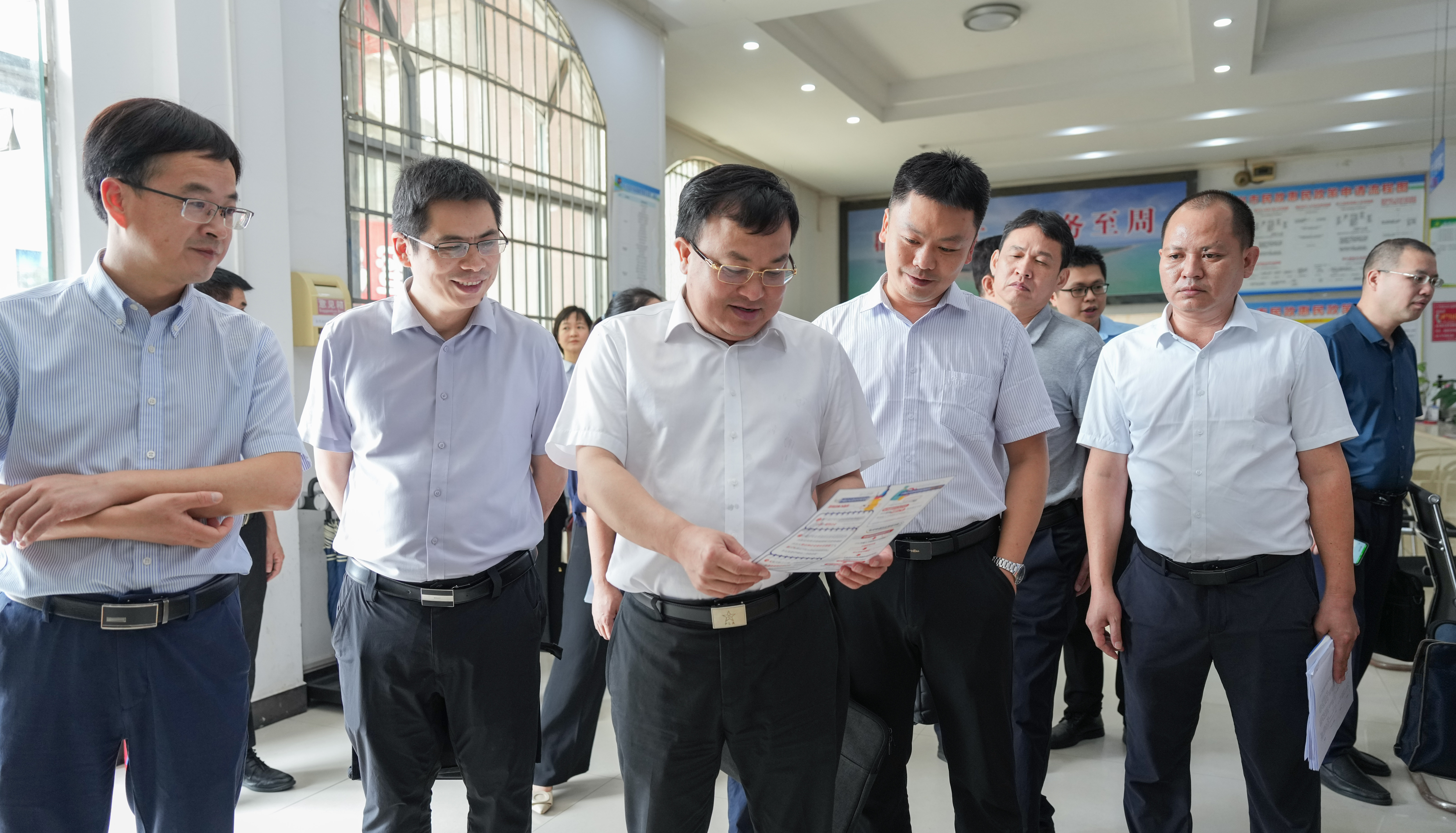 唐标文(中)在江平镇政务服务中心察看人社服务事项告知清单