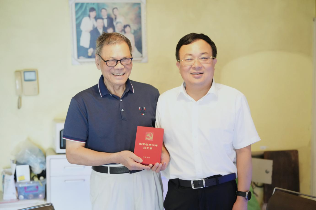 在退休老党员蒋承雄家中,唐标文与他促膝而坐,亲切交谈,询问身体状况和生活情况,倾听他对人社工作的意见建议,向党龄满50年的蒋承雄表示热烈祝贺和崇高敬意,并送上“光荣在党50年”纪念章、慰问品,感谢他一直以来为党和国家事业的辛勤付出,希望他在保重身体的同时,一如既往地支持人社工作,为广西人社事业高质量发展多提“金点子”。
