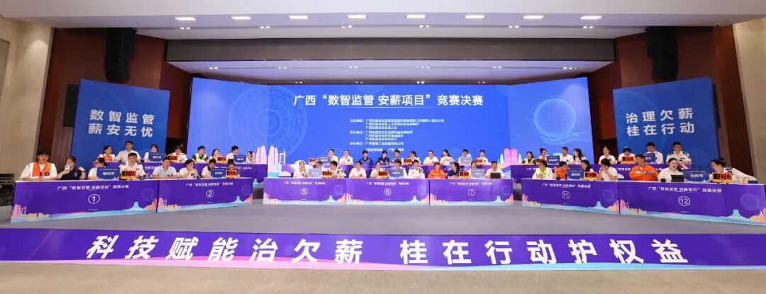 9月11日,广西“数智监管 安薪项目”竞赛决赛在南宁举行。自治区就业促进和劳动保护工作领导小组办公室副主任、自治区人力资源社会保障厅党组副书记、副厅长袁国华,自治区总工会副主席黄韬,自治区住房城乡建设厅、交通运输厅、水利厅等相关部门领导出席决赛现场并为获奖集体和个人颁奖。至此,为期2个月的广西“数智监管 安薪项目”竞赛圆满落下帷幕。