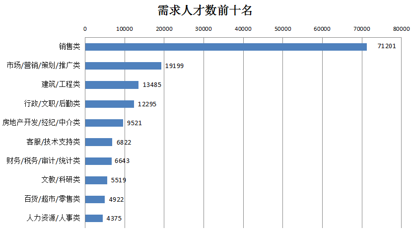 1. 位居需求榜前十名的职位:销售类、市场/营销/策划/推广类、建筑/工程类、行政/文职/后勤类、房地产开发/经纪/中介类、客服/技术支持类、财务/税务/审计/统计类、文教/科研类、百货/超市/零售类、人力资源/人事类等职位类型。这十个职位类型的需求人才数总计153982人,占人才总需求量的40.01%,其中销售类职位需求长期以绝对优势位居首位,其需求人才数达到71201人,占比达到18.50%,比上年同期的41446人增加29755人,增幅为71.79%,本季度需求增长量位居第一位。