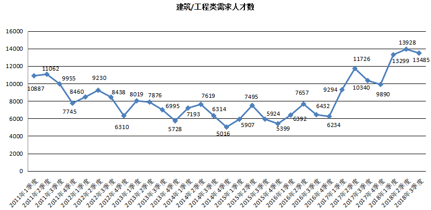 2. 建筑/工程类职位的求职人才数为27399人,创历史新高,与去年同期相比增长3367人,同比涨幅为14.01%。