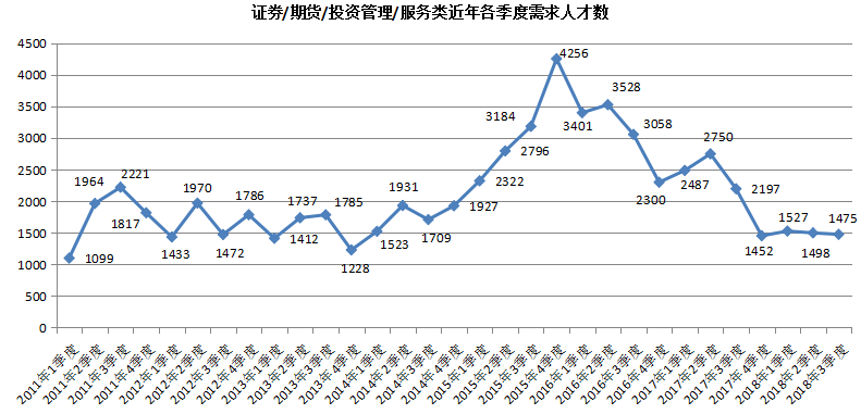 7. 证券/期货/投资管理/服务类职位人才需求持续低迷,人才需求量为1475人,与上年同期的2197人相比减少722人,同比大幅下降32.86%。
