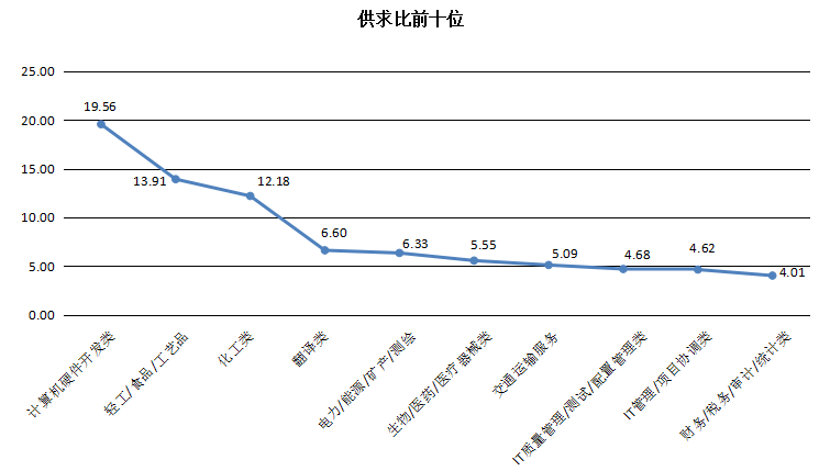 其中,由于需求极少,计算机硬件开发类、轻工/食品/工艺品类及化工类职位就业竞争压力较大,其供求比分别高达19.56、13.9112.18,位居供求比前三位;而服务业三类职位和销售类等职位由于人员流动性大等特征,需求长期旺盛,供求比长期位居供求比后十位,其合计供求比分别仅为0.510.21。